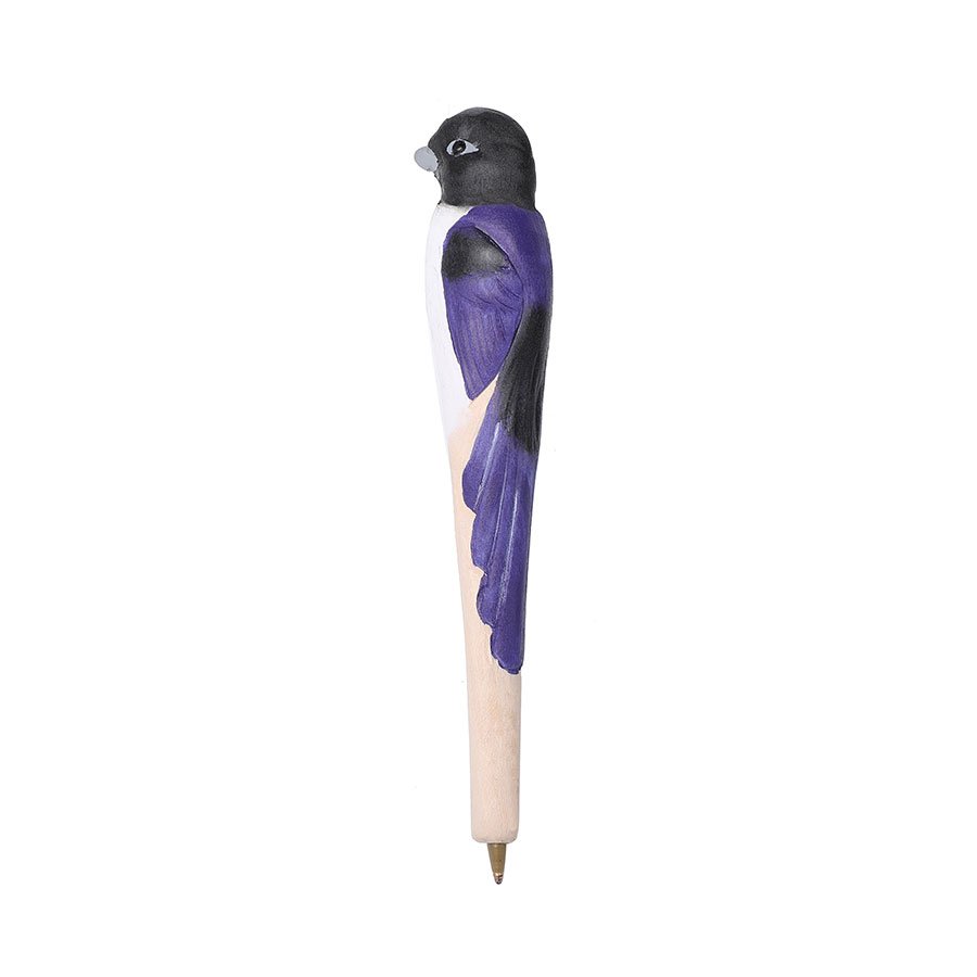 Inspired by the rare and beautiful Seychelles Paradise Flycatcher (Terpsiphone corvina), this elegant handcrafted wooden pen brings together functionality and artistry. The pen is carved and painted to reflect the bird’s signature black head, white belly, and vibrant purple wings, making it not just a writing tool but also a collectible souvenir from paradise.